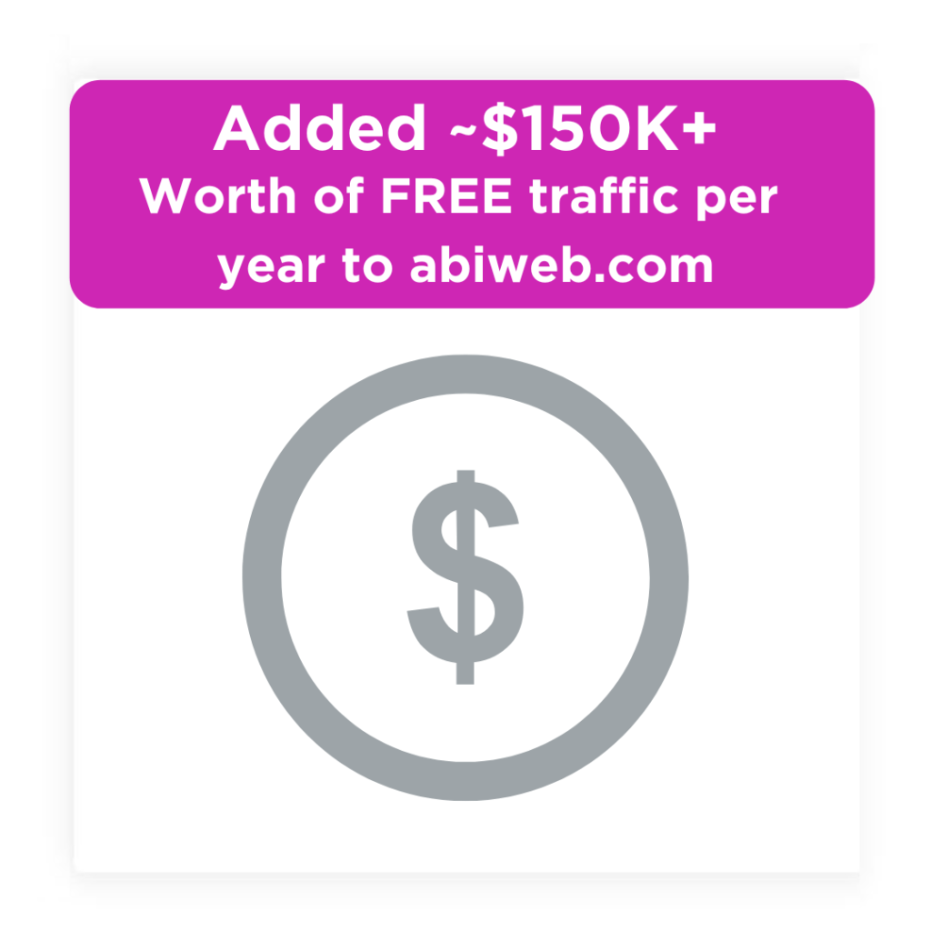 How we did it: Cohesive SEO blogging strategy. The last reported month (May 2019) had an all-time high of $12.1k worth of free traffic to abiweb.com
